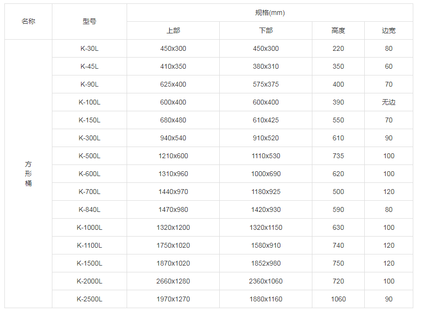 方形桶规格参数表